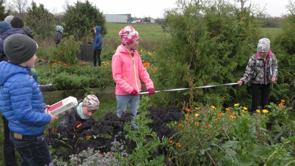 During the summer, students and parents worked in the school garden, watering the planting boxes. In the autumn, several lessons were directly linked to the planting boxes and some classes had their lessons outside. In math, students measured the boxes and calculated the volume of the soil and measured the length of sunflowers. In geography, flower bulbs were planted and different soil types were studied. In history, the history and structure of tulips was studied. In arts, paintings of tulips were made and put up as an exhibition. Mobile apps were used to define various plans in the garden and some crops were also harvested.